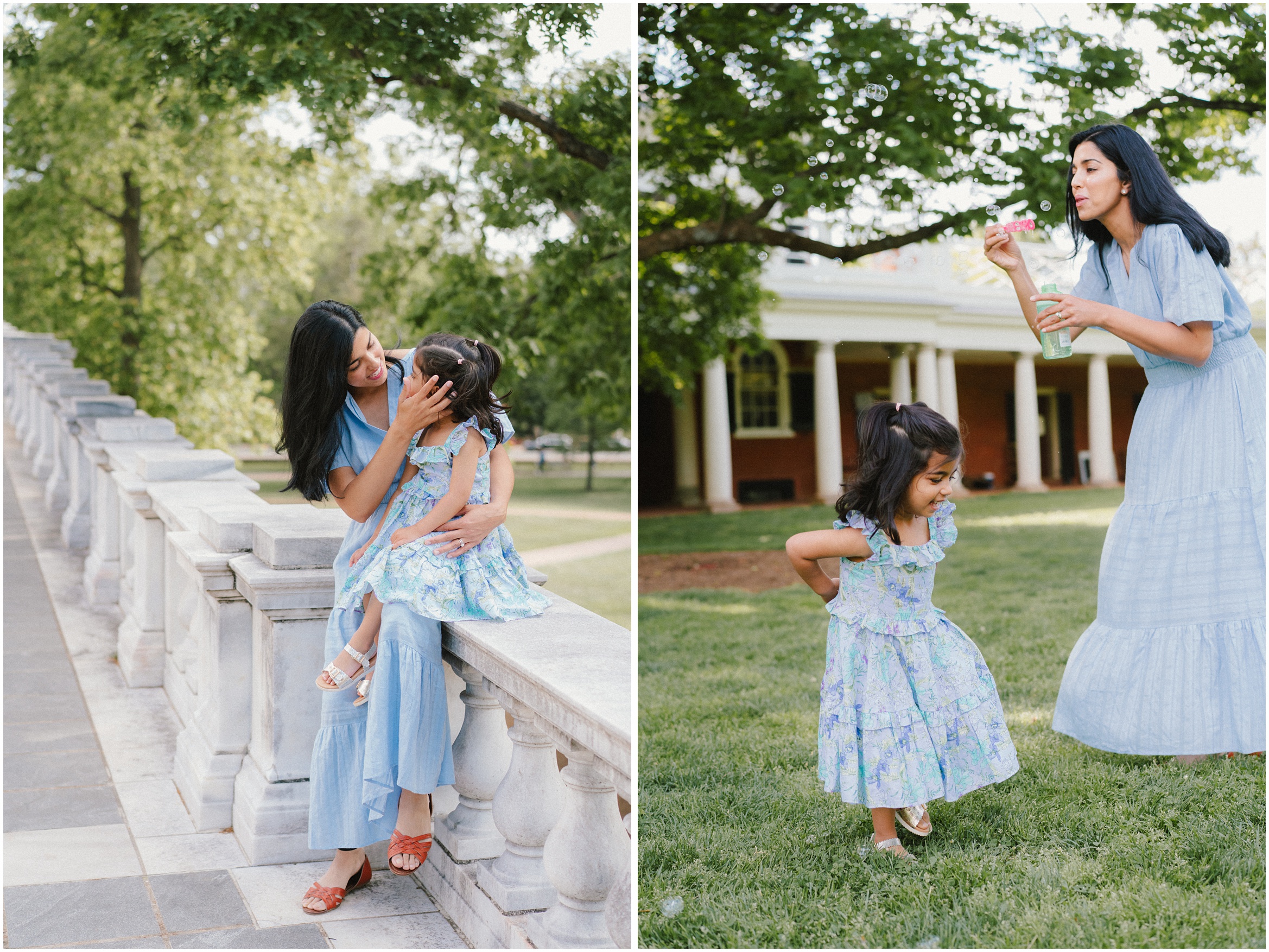 What I’d steer away from: trying to make UVA look like a generic scenic location. I really like playing with location in non-traditional ways, so that it means something to the client but isn’t screaming COLLEGE CAMPUS. The sessions I love most here have an activity baked in — morning coffee from Grit or bagels from Bodo’s paired with a walk to a picnic spot. Then roaming and exploring between fountains, stairs, garden nooks, and the wide open Lawn.